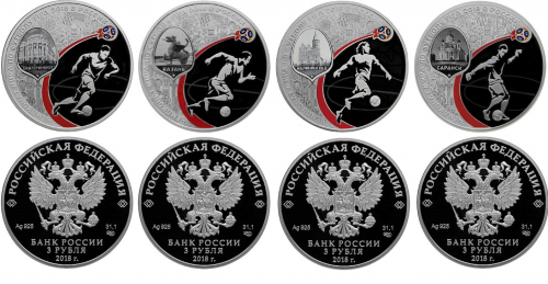 Набор из 4-х монет, посвященный Чемпионату мира по футболу FIFA 2018, первый выпуск, 3 рубля.
