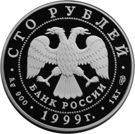 в центре диска — эмблема Банка России (двуглавый орёл художника И.Билибина, под ним надпись полукругом «БАНК РОССИИ»), обрамлённая кругом из точек и надписями по кругу: вверху — «СТО РУБЛЕЙ», внизу — «1999 г.», слева — обозначение металла, проба сплава, справа — содержание драгоценного металла в чистоте и товарный знак монетного двора.