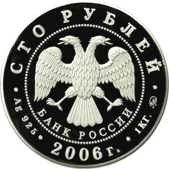 в центре диска – эмблема Банка России (двуглавый орел с опущенными крыльями, под ним надпись полукругом «БАНК РОССИИ»), обрамленная кругом из точек и надписями по кругу: вверху – «СТО РУБЛЕЙ», внизу – «2006 г.», слева – обозначение металла, проба сплава, справа – содержание драгоценного металла в чистоте и товарный знак монетного двора.