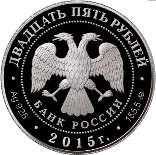 в центре – эмблема Банка России (двуглавый орёл с опущенными крыльями, под ним – надпись полукругом "БАНК РОССИИ"), обрамленная кругом из точек и надписями по кругу – вверху: "ДВАДЦАТЬ ПЯТЬ РУБЛЕЙ", внизу: слева – обозначения драгоценного металла и пробы сплава, в центре – дата выпуска "2015 г.", справа – содержание химически чистого металла и товарный знак монетного двора.