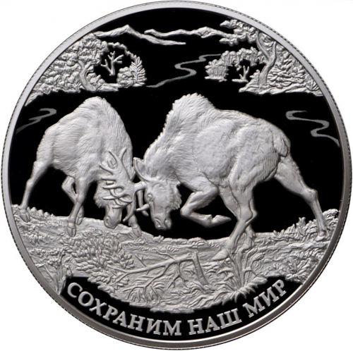 на зеркальном поле диска – рельефное изображение сцены схватки двух лосей самцов, внизу вдоль канта – надпись: "СОХРАНИМ НАШ МИР".