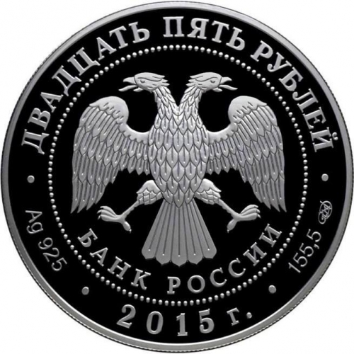 В центре – эмблема Банка России (двуглавый орёл с опущенными крыльями, под ним – надпись полукругом "БАНК РОССИИ"), обрамленная кругом из точек и надписями по кругу – вверху: "ДВАДЦАТЬ ПЯТЬ РУБЛЕЙ", внизу: слева – обозначения драгоценного металла и пробы сплава, в центре – год выпуска "2015 г.", справа – содержание химически чистого металла и товарный знак монетного двора.