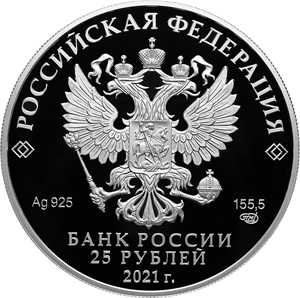 на зеркальном поле диска — рельефное изображение Государственного герба Российской Федерации, над ним вдоль канта — надпись полукругом: «РОССИЙСКАЯ ФЕДЕРАЦИЯ», обрамленная с обеих сторон сдвоенными ромбами, внизу под гербом: слева — обозначения драгоценного металла и пробы сплава, справа — содержание химически чистого металла и товарный знак монетного двора, внизу в центре в три строки — надпись: «БАНК РОССИИ», номинал монеты: «25 РУБЛЕЙ», год выпуска: «2021 г.».