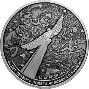 на зеркальном поле диска — рельефные изображения летящей фигуры человека с крыльями и звезды на фоне стилизованных изображений звездного неба и мифологических животных — зодиакальных созвездий Тельца, Льва, Стрельца; внизу вдоль канта — надписи: «12 АПРЕЛЯ 1961 г.», «60 ЛЕТ ПЕРВОГО ПОЛЕТА ЧЕЛОВЕКА В КОСМОС».