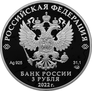 на зеркальном поле диска — рельефное изображение Государственного герба Российской Федерации, над ним вдоль канта — надпись полукругом: «РОССИЙСКАЯ ФЕДЕРАЦИЯ», обрамленная с обеих сторон сдвоенными ромбами, внизу под гербом: слева — обозначения драгоценного металла и пробы сплава, справа — содержание химически чистого металла и товарный знак монетного двора, внизу в центре в три строки — надпись: «БАНК РОССИИ», номинал монеты: «3 РУБЛЯ», год выпуска: «2022 г.».