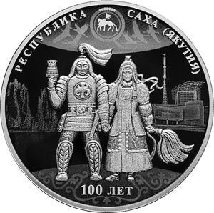 на зеркальном поле диска изображены мифологические герои якутского национального эпоса «Олонхо» — Ньургун Боотур и Туйаарыма Куо. Изображение фигур героев выполнено в рельефе на фоне видов природного парка «Ленские столбы» и современных архитектурных объектов Якутска. Вверху — изображения герба Республики Саха (Якутия) и силуэтов летящих стерхов. Имеются надписи, вверху вдоль канта: «РЕСПУБЛИКА САХА (ЯКУТИЯ)», внизу, на фоне национального орнамента: «100 ЛЕТ».