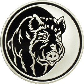 Реверс: в круге, обрамлённом сплошным ободком, слева – изображение кабана, справа – матированное изображение полумесяца.