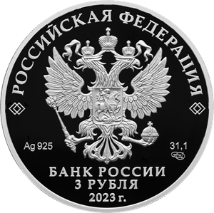 рельефное изображение Государственного герба Российской Федерации, над ним вдоль канта – надпись полукругом «РОССИЙСКАЯ ФЕДЕРАЦИЯ», обрамленная с обеих сторон сдвоенными ромбами, под гербом: слева – обозначения драгоценного металла и пробы сплава, справа – содержание химически чистого металла и товарный знак монетного двора, внизу в центре в три строки – надпись «БАНК РОССИИ», номинал монеты «3 РУБЛЯ», год выпуска «2023 г.».