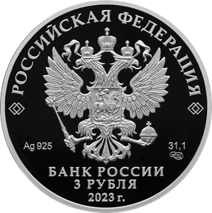 рельефное изображение Государственного герба Российской Федерации, над ним вдоль канта – надпись полукругом «РОССИЙСКАЯ ФЕДЕРАЦИЯ», обрамленная с обеих сторон сдвоенными ромбами, под гербом: слева – обозначения драгоценного металла и пробы сплава, справа – содержание химически чистого металла и товарный знак монетного двора, внизу в центре в три строки – надпись «БАНК РОССИИ», номинал монеты «3 РУБЛЯ», год выпуска «2023 г.».