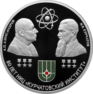 рельефные изображения портретов трижды Героев Социалистического Труда, академиков А.П. Александрова и И.В. Курчатова, золотых медалей «Серп и Молот» и символа атома; внизу — выполненное в цвете изображение эмблемы НИЦ «Курчатовский институт»; по окружности — рельефные надписи: слева — «А.П. АЛЕКСАНДРОВ», справа — «И.В. КУРЧАТОВ», внизу — «80 ЛЕТ НИЦ «КУРЧАТОВСКИЙ ИНСТИТУТ».