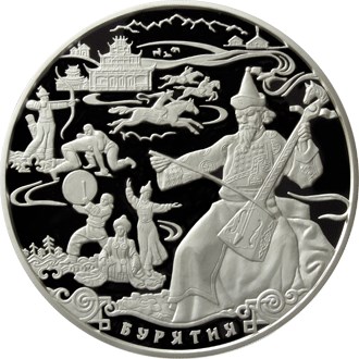 рельефные изображения сценок народного праздника:, справа - фигура мужчины в национальной одежде, играющего на струнном инструменте морин-хур, слева - мужчина с бубном и две девушки, исполняющие народный танец, в верхней части диска слева - пара борцов и стрелок из лука, в центре - три всадника во время скачек, на заднем плане на фоне контурного изображения гор слева - культовые сооружения и три фигурки пасущихся животных, справа - две юрты, внизу вдоль канта - надпись: "БУРЯТИЯ", обрамленная с обеих сторон элементами национального орнамента.