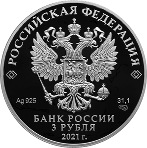 на зеркальном поле диска — рельефное изображение Государственного герба Российской Федерации, над ним вдоль канта — надпись полукругом: «РОССИЙСКАЯ ФЕДЕРАЦИЯ», обрамленная с обеих сторон сдвоенными ромбами, внизу под гербом: слева — обозначения драгоценного металла и пробы сплава, справа — содержание химически чистого металла и товарный знак монетного двора, внизу в центре в три строки — надпись: «БАНК РОССИИ», номинал монеты: «3 РУБЛЯ», год выпуска: «2021 г.».