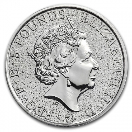 На аверсе серебряной инвестиционной монеты "Лев Англии" - портрет Ее Величества Королевы Елизаветы II, выполненный Джоди Кларком, представленный на британских монетах с 2015 года (так называемый пятый тип монетного портрета королевы). По краю монеты расположены надписи, указывающие на номинал монеты и имя Королевы: 5 POUNDS / ELIZABETH II / D / G / REG / F / D (5 фунтов стерлингов, Елизавета II, Божьей Милостью Королева - Защитница Веры).