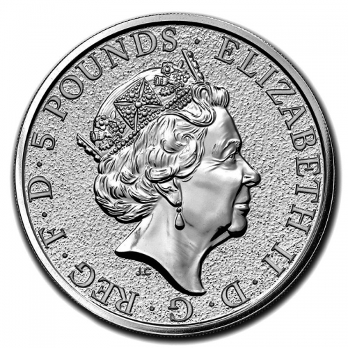 На аверсе серебряной инвестиционной монеты "Лев Англии" - портрет Ее Величества Королевы Елизаветы II, выполненный Джоди Кларком, представленный на британских монетах с 2015 года (так называемый пятый тип монетного портрета королевы). По краю монеты расположены надписи, указывающие на номинал монеты и имя Королевы: 5 POUNDS / ELIZABETH II / D / G / REG / F / D (5 фунтов стерлингов, Елизавета II, Божьей Милостью Королева - Защитница Веры).
