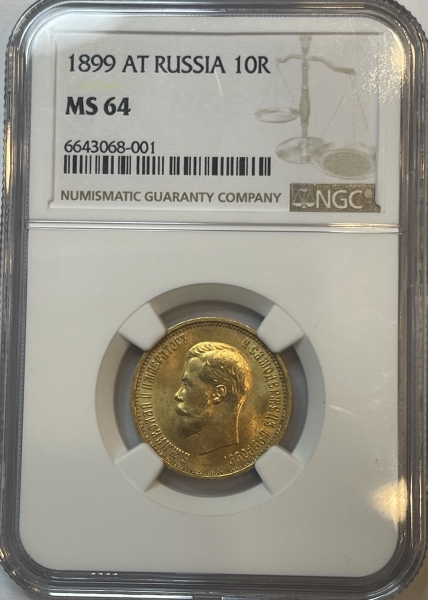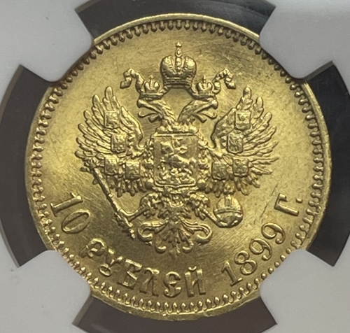 Золотая монета 10 рублей Николай II 1899г.,АГ, в слабе NGC MS 64
