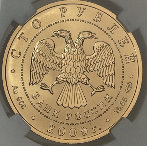 в центре диска - эмблема Банка России (двуглавый орел с опущенными крыльями, под ним надпись полукругом "БАНК РОССИИ"), обрамленная кругом из точек и надписями по кругу: вверху - "СТО РУБЛЕЙ", внизу - "2009 г.", слева - обозначение металла, проба сплава, справа - содержание драгоценного металла в чистоте и товарный знак монетного двора.