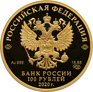 на зеркальном поле диска — рельефное изображение Государственного герба Российской Федерации, над ним вдоль канта — надпись полукругом: «РОССИЙСКАЯ ФЕДЕРАЦИЯ», обрамленная с обеих сторон сдвоенными ромбами, внизу под гербом: слева — обозначения драгоценного металла и пробы сплава, справа — содержание химически чистого металла и товарный знак монетного двора, внизу в центре в три строки — надпись: «БАНК РОССИИ», номинал монеты: «100 РУБЛЕЙ», год выпуска: «2020 г.».