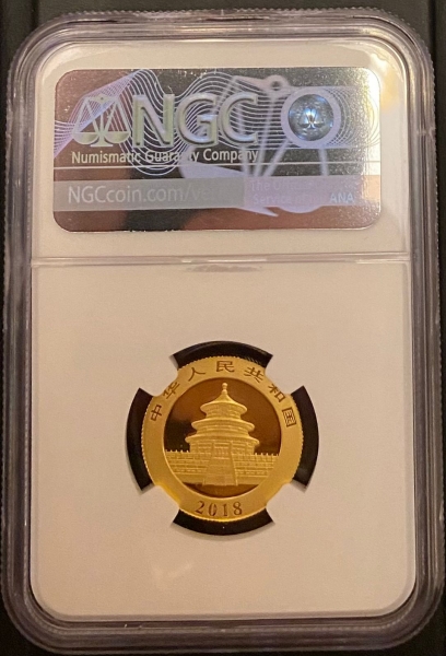 Золотая монета 100 юаней "Панда" 2018г., 8 г., 999 проба в слабе NGC MS 69