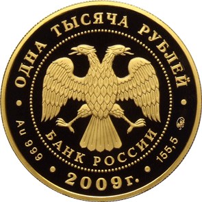 в центре - эмблема Банка России (двуглавый орёл с опущенными крыльями, под ним - надпись полукругом "БАНК РОССИИ"), обрамленная кругом из точек и надписями по кругу - вверху: "ОДНА ТЫСЯЧА РУБЛЕЙ", внизу: слева - обозначения драгоценного металла и пробы сплава, в центре - дата выпуска "2009 г.", справа - содержание химически чистого металла и товарный знак монетного двора.