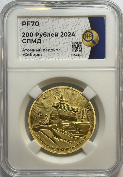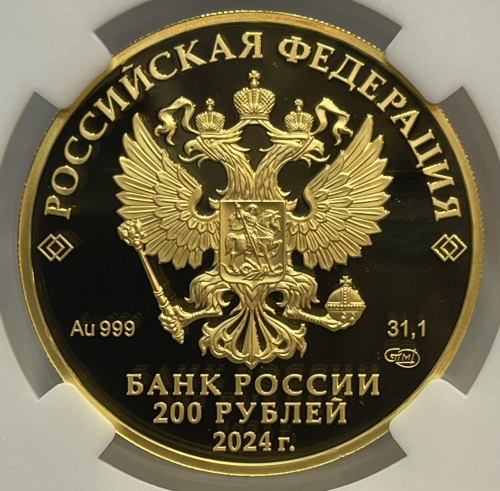 рельефное изображение Государственного герба Российской Федерации, над ним вдоль канта – надпись полукругом «РОССИЙСКАЯ ФЕДЕРАЦИЯ», обрамленная с обеих сторон сдвоенными ромбами, под гербом слева – обозначения драгоценного металла и пробы сплава, справа – содержание химически чистого металла и товарный знак монетного двора, внизу в центре в три строки – надпись «БАНК РОССИИ», номинал монеты «200 РУБЛЕЙ», год выпуска «2024 г.».