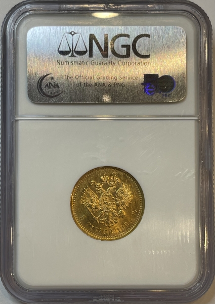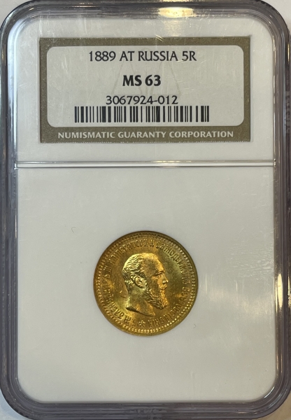 Золотая монета 5 рублей Александр III 1889 г. в слабе NGC MS 63