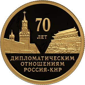 По центру изображены Спасская башня Московского Кремля на Красной площади в Москве и ворота Тяньаньмэнь на площади Тяньаньмэнь в Пекине. Между изображениями и под ними горизонтальная надпись в пять строк «70 ЛЕТ ДИПЛОМАТИЧЕСКИМ ОТНОШЕНИЯМ РОССИЯ–КНР».