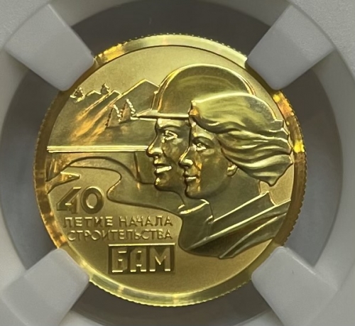 Справа на зеркальном участке диска – рельефные головные портреты юноши в каске строителя и девушки на фоне гор, слева внизу, на матовом участке диска – надпись в четыре строки: "40 ЛЕТИЕ НАЧАЛА СТРОИТЕЛЬСТВА БАМ".