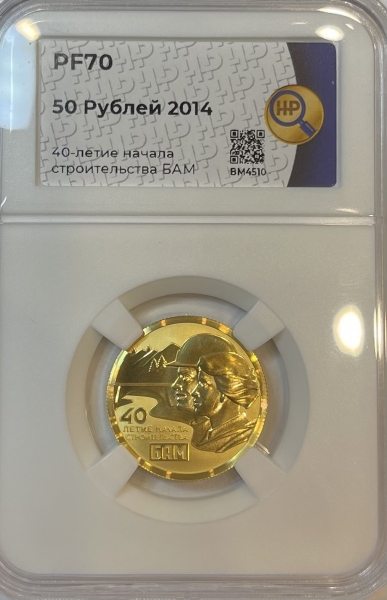 Золотая монета 50 рублей "БАМ" в слабе ННР PROOF 70 , 2014 г.