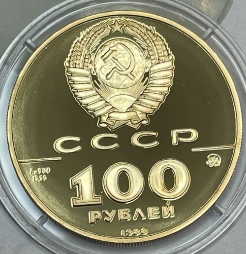 Сверху герб СССР с 15 витками ленты, под ним буквы «СССР», ниже слева и справа черта, под чертой слева химическое обозначение «Au» и проба «900» металла из которого сделана монета, под ними чистый вес драгоценного металла «15,55», под чертой справа монограмма монетного двора «ММД», ниже обозначение достоинства монеты цифра «100» и ниже слово «РУБЛЕЙ», внизу у канта год выпуска монеты «1988».