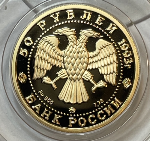 в центре диска - эмблема Банка России (двуглавый орёл художника И. Билибина), под ним: слева - обозначение металла, проба сплава, в центре - товарный знак монетного двора, справа - содержание драгоценного металла в чистоте. По окружности надписи, обрамлённые кругом из точек: вверху - "50 РУБЛЕЙ 1993 г.", внизу - "БАНК РОССИИ".