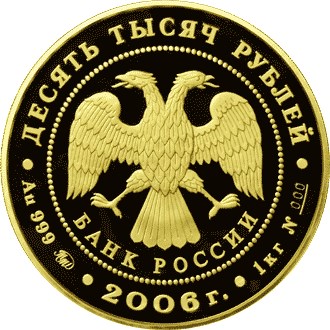 в центре - эмблема Банка России (двуглавый орел с опущенными крыльями, под ним - надпись полукругом "БАНК РОССИИ"), обрамленная кругом из точек и надписями, вверху - номинал: "ДЕСЯТЬ ТЫСЯЧ РУБЛЕЙ", внизу: слева - обозначения драгоценного металла, пробы сплава и товарный знак монетного двора, в центре - год выпуска "2006 г.", справа – содержание химически чистого металла и порядковый номер монеты №s__.